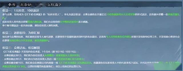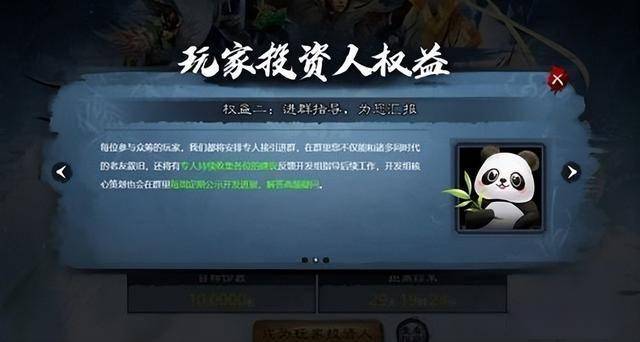 在制作组的计划中,玩家只需交上一元钱,就可以成为“玩家投资人”。加入该计划后,玩家不仅能在游戏上线 倍礼包返还权益,还可以通过群聊参与开发讨论、提供建议,而游戏的开发进展也将会实时更新在群聊里。制作组表示,随着众筹份数越多,玩家也能享受到更多权益,甚至参加游戏的内测试玩活动。
